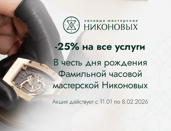 Акция действует с 11 января по 8 февраля. Фамильные часовые мастерские Никоновых работают в Санкт-Петербурге, Москве и Краснодаре. Это уникальный проект с собственной внутрикорпоративной школой обучения часовщиков, предлагающий полный спектр услуг по ремонту премиальных часов и ювелирных изделий с эксклюзивной гарантией 2 + 2. Уже более 16 лет наши высококлассные мастера выполняют диагностику, обслуживание, ремонт и реставрацию часов и ювелирных изделий любой сложности. Ежемесячно через мастерские Никоновых проходят десятки сложнейших моделей от ведущих мировых часовых и ювелирных домов. Благодаря этому наши мастера обладают уникальным практическим опытом в ремонте часов класса люкс — от реставрации корпусов до изготовления отдельных деталей механизма. Подарите своим часам новую жизнь. Ждем вас, наши двери открыты всегда